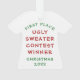 Na frente, há uma suéter feia de Natal pintada em aquarela em verde, vermelho e branco. Em uma faixa vermelha no peito, está a mensagem "Primeiro Lugar". Nas costas, há apenas texto vermelho e verde: a mensagem "Primeiro Lugar" está arqueada acima, em letras maiúsculas verdes, a mensagem "Vencedor do Concurso de Suéter Feia" está em letras vermelhas maiores e abaixo dela, a palavra "Natal" e o ano estão em verde.