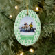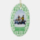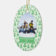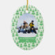 Este ornamento cerâmico dado forma oval do feriado do Natal tem um fundo verde macio com lotes de árvores de Natal verdes no fundo. No meio, você pode personalizar a fotografia da família com seus próprios. Abaixo da foto, há uma bandeira verde e branca onde você possa personalizar o nome e o ano de família. Você poderia personalizar o texto para o primeiro Natal de um bebê ou mesmo nosso primeiro Natal para recentemente um casal!