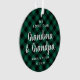 Este aconchegante ornamento de dois lados apresenta um padrão de xadrez verde e preto, texto branco e um modelo de foto. Na frente do ornamento, "Nós amamos nossa vovó e vovô" está escrito em letras brancas e em bonito roteiro. Personalize este texto com suas próprias palavras. Você também pode adicionar os nomes dos netos e uma data no fundo. No verso, você pode adicionar uma foto circular dos netos.