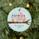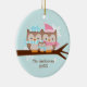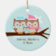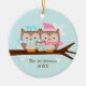 Enfeites de natal personalizáveis com uma adorável família de corujas empoleiradas em um galho de árvore em cores pastel suaves.