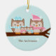 Enfeites de natal personalizáveis com uma adorável família de corujas empoleiradas em um galho de árvore em cores pastel suaves.