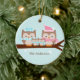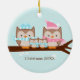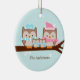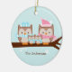 Enfeites de natal personalizáveis com uma adorável família de corujas empoleiradas em um galho de árvore em cores pastel suaves.