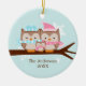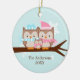 Enfeites de natal personalizáveis com uma adorável família de corujas empoleiradas em um galho de árvore em cores pastel suaves.