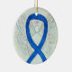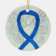 O ornamento do anjo da guarda apresenta a pintura de um anjo azul de fita de reconhecimento. A arte da fita de anjo de consciência azul pode ser personalizada com mensagens personalizadas para fazer ornamentos de causas de excelentes ou pendentes para arrecadadores de fundos, presentes de Natal ou feriados, ou outros eventos ou ocasiões especiais.