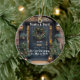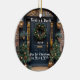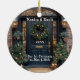 Enfeites de natal especial com a imagem de uma porta marinho azul frontal, com janela de transmissão, uma faixa bonito de Feriado em ouro e verde. Lindas árvores de natal de Natal de Férias em cada lado da porta, com bonito luzes de varanda brilhantes. Adicione seu texto para personalizar este belo ornamento.