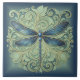 This elegant ceramic tile features a beautifully detailed Art Nouveau–inspired dragonfly, rendered in rich shades of blue with gold-accented outlines. Intricate swirling leaves and graceful botanical scrollwork surround the central motif, creating a sophisticated, ornamental look. The soft teal background gently fades toward a deep border, giving the artwork depth and a refined framed effect.