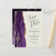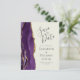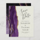 A borda esquerda deste elegante convite de casamento moderno apresenta uma cor d'água roxa, borda agitada, aparada com falso brilho dourado. O texto personalizável combina a escrita manual de cinzas de carvão, as fontes em copperplate e itálico em um fundo de marfim. O verso apresenta um design de agate roxo e dourado correspondente.