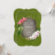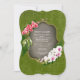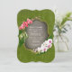 Este design de convite para o casamento apresenta uma estética romântica, inspirada na natureza, com um quadro verde ousado, que lembra um cenário de jardim de messias. A parte superior esquerda do quadro é adornada com orquídeas rosa elegantes, enquanto a parte inferior direita exibe orquídeas brancas vibrantes. Esses elementos florais enquadram a parte central do convite, que tem um fundo de cinza macio e texturizado. O texto é formal, mas acessível. O convite solicita a presença de convidados em seu casamento, seguido de detalhes sobre a data, hora e local em um layout claro e refinado. Esta design combina lindamente um tema exuberante e orgânico com uma elegância subestimada, perfeita para um jardim semissformal ou casamento ao ar livre.