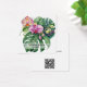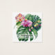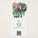 Um cartão de visita com fundo branco com flores de orquídea e folhas de monstera.