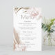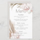Este elegante e romântico cardápio de casamento apresenta uma design de cor de água floral tropical. Lindos buquês de flores de orquídeas coloridas, grama-pampas e folhas de palma são ilustrados no canto superior esquerdo e inferior direito.