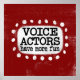 "Os Atores de Voz se Divertem" é um design de texto bonito em vermelho com texto preto, junto com uma forma de sotaque branca e pontos brancos texturizados ao seu redor.