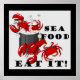 Um design gráfico de lagostas e um caranguejo cozido pelo artista/designer Charmaine Paulson numa poster. O poster tem o texto Comida do mar Coma!