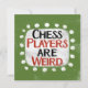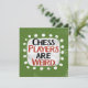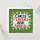 "Os Jogadores de Xadrez são Estranhos" é um design de texto bonito em verde com texto preto e vermelho, juntamente com uma forma de sotaque branco e pontos brancos texturizados ao seu redor.
