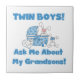 Novos e orgulhosos avós de bebês gêmeos vão adorar esta design azul bonita que apresenta dois coelhos num berço azul e um texto azul que diz "Pergunte-me sobre os meus netos!"