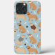 Cães de varejo Ouros bonitos, com casacos escuros e leves, sentam-se e ficam com ossos de cão espalhados e pegadas em um fundo azul.
