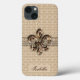 Nome Personalizado Dourado Fleur De Lis iPhone 13 Case - Fundo de cor damasco colorido de creme elegante com uma tendência de chic Fleur De Lis/Fleur De Lys embelezado e modelo de nome personalizado na parte inferior.