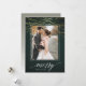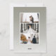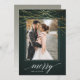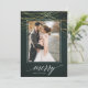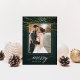 O cartão com fotos de férias elegante apresenta um rico fundo verde caçador, apedrejado com terras leves de folha de ouro falso no topo. Adicione a sua foto favorita vertical ou orientada a retratos, formada por uma borda branca. A "Feliz" aparece na parte inferior em letras brancas de escrita em caligrafia, com o nome da sua família preso ao design. Personalize as costas com três fotos adicionais e uma saudação de Natal personalizada.