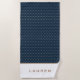 Pegue sua toalha de praia personalizada para um olhar elegante com padrão chic de ouro e âncoras prateadas em fundo azul marinho. Monograma está em uma borda branca na parte inferior em sans serif gold.
