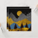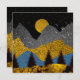 design de paisagem da montanha abstrato em tons de ouro, preto e azul em tons negros, com um luar e pássaros.