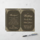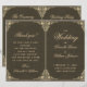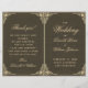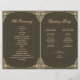Um elegante programa de casamento dobrado com um ar vintage, tendo em ambos os lados duas molduras decorativas barrocas douradas idênticas ao redor dos textos. Os títulos e os nomes da noiva e do noivo são escritos em uma elegante caligrafia, o restante em letras maiúsculas. O fundo é preto, o texto é dourado, semelhante às molduras douradas.