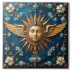 Deus do Sol ouro com asas e rosto humano, cercado por ornamentos florais, colocado sobre um fundo azul marinho, detalhes intrincados, composição simétrica, design ornamentado, arte da fantasia.