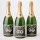 Vinho de aniversário elegante, glamouroso e feminino ou rótulo de garrafa de vinho espumante. Brilhante preto com falso ouro e um quadro de ouro. Modelos de nome, 70 anos e data. Data de nascimento ou data da festa/aniversário. Letras brancas e ouros coloridas. O nome é escrito com um script de estilo manuscrito.