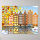 Vista urbana de Amesterdã (canal, casas, barcos e um ramo da árvore do outono com folhas em queda). Tema da cor do outono: amarelo, laranja, castanho, azul.