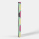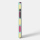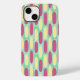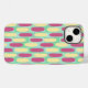 Esta capa de telefone tem uma design geométrica feita de um fundo de retângulos verde-marinho e azul-claro com ovais amarelos e cor-de-rosa no topo.