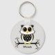 Chaveiro de Botão Básico com uma coruja dourada, preta e branca num membro com folhas e bagas.