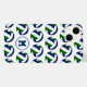Esta capas de iphone temática divertida de voleibol apresenta um padrão simples de volichões que têm painéis azuis, verdes e brancos num fundo branco personalizável - personalizado com o monograma do atleta - por katz_d_zynes