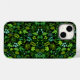Padrão vegetal.14b - padrão de plantas enforcadas Esta imagem é um padrão repetitivo de várias folhas verdes, dispostas em um design simétrico, quase caleidoscópico. As folhas são desenhadas num estilo simples, quase cartoonista, com várias formas e tamanhos. O pano de fundo é transparente, dando a impressão de uma cobertura florestal foliar. O efeito geral é de vibração e vida, com sentido de repetição e ordem.