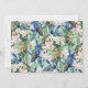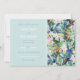 Flores e aves florescentes românticas pintura botânica primavera, com coelhos coloridos, aves azuis, aves amarelas, flores magnólias brancas e cor-de-rosa, pequenas flores amarelas e flores brancas, várias formas de folha verde, padrão de temas botânicos com fundo azul-ciano pálido. Uma arte única de botânica.