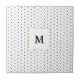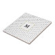 Um padrão de bolinhas preta está sobre um fundo branco. O monograma preto está num quadrado branco no centro. O quadrado tem um aparador de ouro falso (sem folha).