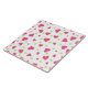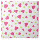 Um azulejo cerâmico com um padrão fofo composto de corações cor-de-rosa e verdes tropeçando em fundo branco.