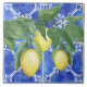 "Watercolor Lemon Citrus Foliage Pattern Blue White cerâmica azulejo". azulejo de direção esquerda (use com a direita para criar uma borda contínua). O cobalto, azul de safira com padrão branco pintado com aquarela acrílica apresenta limões pendurados num galho com vegetação foliar folha. Criada por uma artista e designer internacional, Audrey Jeanne Roberts, copyright.