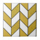 Esse azulejo cerâmico moderno apresenta um design chevron elegante com padrão geométrico heríngeo em branco e falso brilho dourado com linhas pretas.