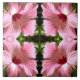 Nesse grande Azulejo cerâmico, flores brilhantes de hibisco rosa são objeto do padrão de jardim tropical com um olhar "country floral". Há quatro lindos, amplos e abertos voltados para dentro de cada esquina. As pétalas de flores são cor-de-rosa muito profundo no centro, curvando graciosamente para fora à medida que as pétalas mudam para uma cor rosa mais leve. O fundo é um padrão formado por tons de verde natural nas folhas da planta. Este padrão foi feito de uma fotografia original do HomeWare.