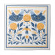 Esse atraente azulejo cerâmico tem um belo e intrincado padrão nórdico de estigma em azul e ouro sobre fundo branco. Os elementos incluídos no padrão são pássaros-padrão, imagens florais, coração e folhas. O padrão é enquadrado em linhas azuis e douradas correspondentes. Muito bonito, especialmente unido como decoração de borda.