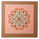 Azulejo cerâmico em um padrão mandala de doze pontos em tons de chocolate marrom, bronzeado, creme e coral profundo com fundo rosa claro de coral, bordado em caramelo