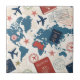 Azulejo cerâmico clássico com padrão inspirado em viagens, apresentando passaportes, aviões, carimbos de viagem, bússolas e um fundo de mapa mundial azul claro. Ideal para viajantes, entusiastas da aviação, buscadores de aventuras e qualquer pessoa que ame a estética da vontade de viajar.