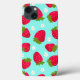 Uma capa de telefone de célula com um padrão de morango fofo com margaridas em fundo azul. O caso perfeito para amantes da fruta.