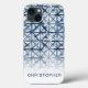"Padrão moderno de Shibori Abstrato azul e branco com seu nome personalizado, caso do iPhone 13." Aquarela, antigo padrão de coloração "X" no estilo de gravata Shiborit japonês em marinho, azul-claro e branco foi pintado na canvas e desaparece em seu nome para uma capa de telefone simples, minimalista e na moda que funciona para homens ou mulheres. Arte de uma artista e designer internacionalmente licenciada, Audrey Jeanne Roberts, copyright.