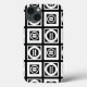 O padrão geométrico preto apresenta quatro quadrados brancos com espaço entre eles sobre fundo preto. Os quadrados grossos diagonalmente opostos contêm cada um um um círculo branco fino com um dentro de signo grosso igual. Por outro lado, os quadrados finos contêm cada um um um círculo branco espesso que toca as arestas do quadrado com um dentro de sinal fino vertical igual. Imagem criada digitalmente. Copyright © 2015 Claire E. Skinner. Todos os direitos reservados.