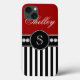 Esse design de estampamento monograma de listras pretas e brancas é formado por um padrão de listras verticais, um impressão de fileira de diamantes brancos em uma faixa de fita preta e uma área vermelha de cor de fundo. Você pode adicionar seu nome e monograma inicial em lindas fontes de script. Seja na moda e menina ao mesmo tempo. Design por Elke Clarke ©2012 para MonogramasGallery. Entre em contato com o designer para outras cores de fundo.