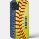 Linda IMAGEM contemporânea de uma bola de softball amarela brilhante com costura vermelha e parcialmente coberta com jeans de denim azul têxtil. Com espaço para ou com o seu nome, iniciais, monograma ou número uniforme de camisa. Este design de hipster divertido, moderno e caprichoso foi criado para a moda artística amorosa do esporte ou diva de moda artística, a moda da quadra ou o pai, fã ou jogador de softball, treinador ou treinador. Chic e legal item para a esportiva ou mulher esportiva que deseja um acessório original do gadget.