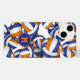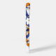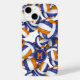 Esta capas de iphone tematizada de vôlei para meninas apresenta volichões de tamanho azul, laranja e branco, dispostos em um padrão aleatório sobre um fundo branco personalizável — os painéis azul e laranja do volleyball são misturados com um padrão caleidoscópico floral para uma aparência esporosa e artística que ainda é esportiva - personalize seu monograma - por katz_d_zynes