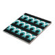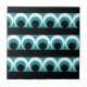 Ilustração geométrica de padrões com faixas, círculos e formas redondas em turquesa, preto e branco
