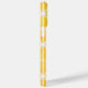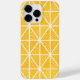 Um caso bonito e colorido iPhone 14 com um padrão geométrico de triângulo amarelo e branco com bolinhas sobre fundo de aquarela.