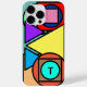 Monograma inicial em texto preto no círculo teal inferior. Padrão geométrico engraçado com azul, laranja vermelha, rosa, lacrimejo, roxo, amarelo, verde-lacrimejo, castanho. Formas geométricas divertidas em círculos, triângulos, padrão retangular. Design original © TamiraZDesign.