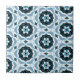 Design de azulejo de cerâmica vibrante com um padrão decorativo composto por formas geométricas em azul, preto e branco.